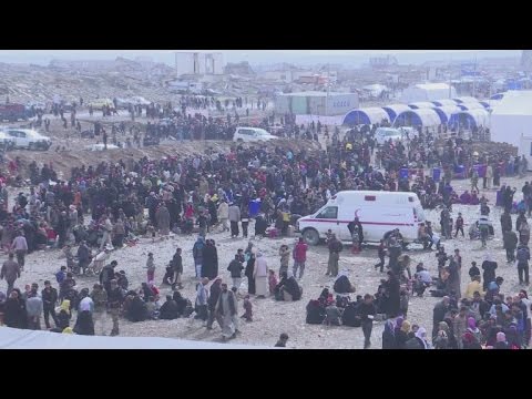 Los desplazados por los combates entre fuerzas iraquíes y yihadistas en el oeste de Mosul se abarrotan en los campamentos ubicados en los alrededores de la ciudad. Muchos deben guarecerse en la intemperie a la espera que una tienda.