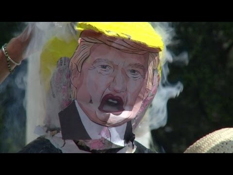 Un grupo de mexicanos rompe y quema piñata del candidato republicano a la presidencia de Estados Unidos, Donald Trump, en la Ciudad de México para protestar contra su propuesta política.