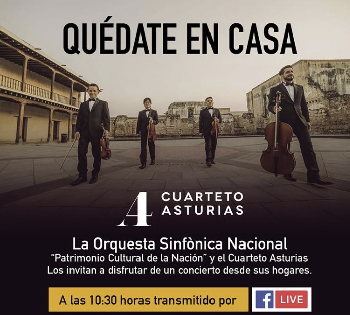 La Orquesta Sinfónica Nacional y el Cuarteto Asturias transmitirán un concierto desde el Conservatorio Nacional, para que todos lo puedan ver desde sus casas y así prevenir el contagio del coronavirus.