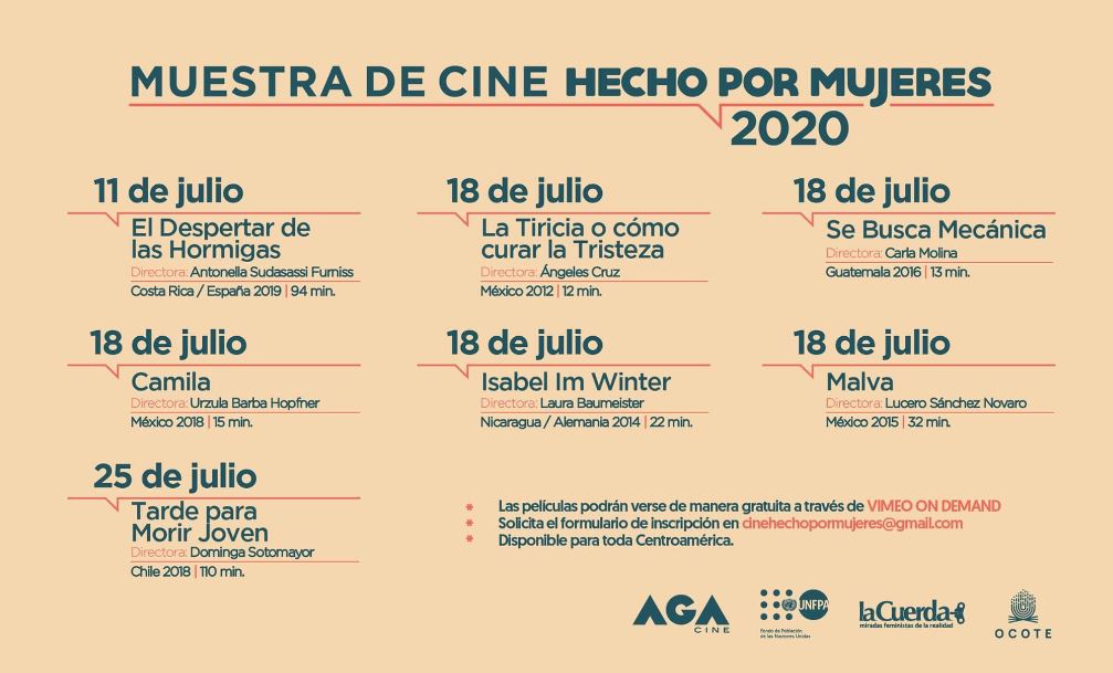 La segunda edición de la Muestra de Cine Hecho por Mujeres se difundirá del 11 al 28 de julio en un formato en línea para toda Centroamérica, aseguró este martes la Asociación Guatemalteca del Audiovisual y la Cinematografía, Agacine.