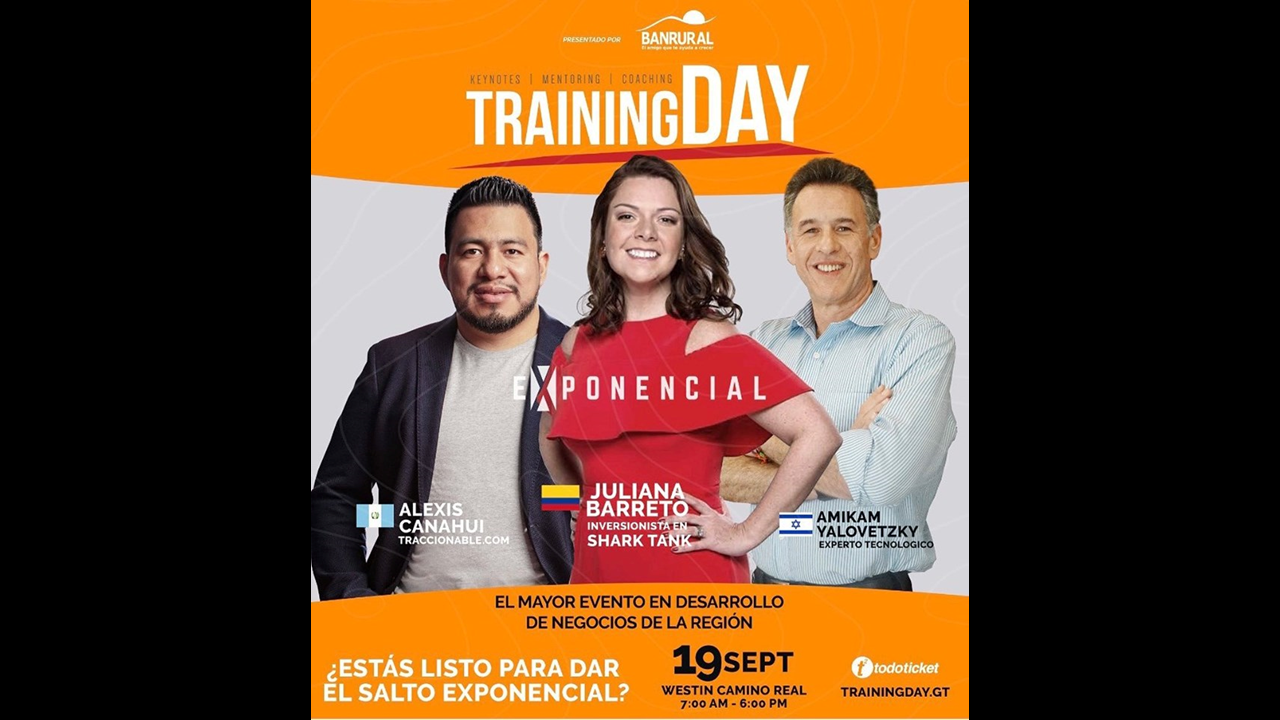 Los organizadores mencionan que se ha consolidado como el principal evento de desarrollo de negocios, la cualofrece una plataforma de networking y equipamiento. Podrá ser parte del próximo Training Day, este jueves 19 de septiembre en el Westin Camino Real y disfrutar de los mejores speakers de Guatemala y del mundo, bajo el tema “Exponencial”.