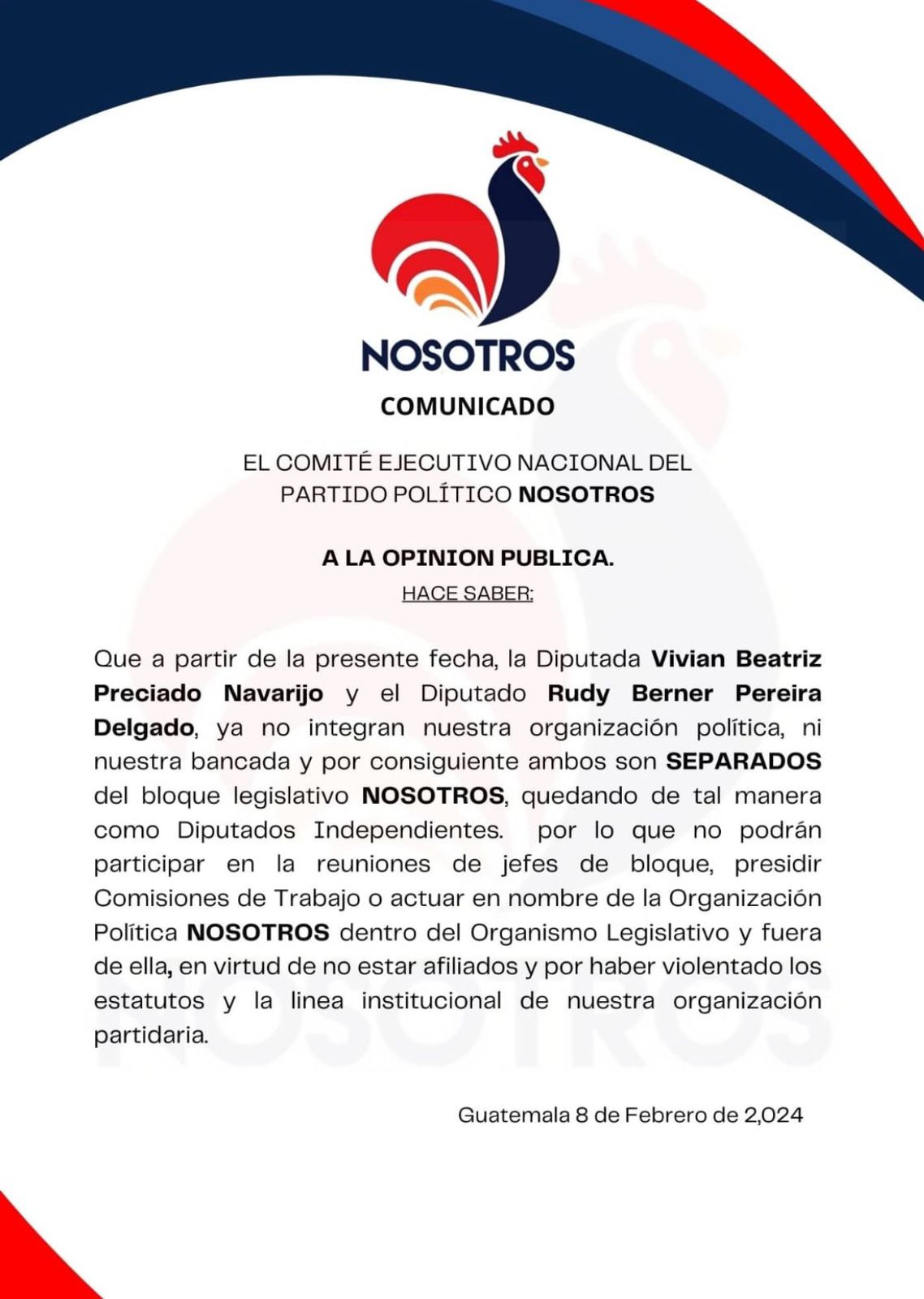 El Partido Político Nosotros informa que la diputada Vivian Beatriz Preciado Navarijo y el diputado Rudy Berner Pereira ya no integran esa organización política ni la bancada, por lo que ahora son diputados independientes.
