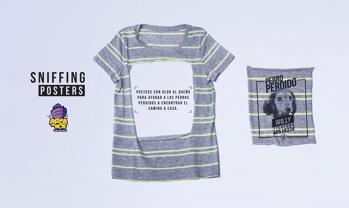 <div> Perder un perro es tan doloroso como perder a un miembro de la familia, pero reconocer</div><div> a un perro a simple vista es mucho más difícil por sus rasgos físicos. Ante esta situación,</div><div> Arca de Noé (Shop for pets) se dio a la tarea de buscar la manera de hacer más efectivos</div><div> los pósters típicos que se usan, creando pósters con olor al dueño a partir de sus</div><div> prendas usadas.</div>