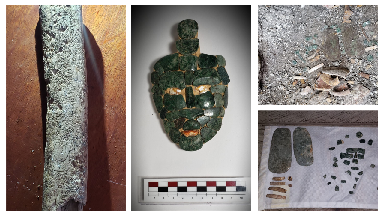 Además de un esqueleto encontrado en su 50%, la máscara y los demás objetos se mantienen resguardados para estudio y restauración en suelo nacional. El arqueólogo Estrada-Belli espera que la máscara de jade pueda ser entregada al Ministerio de Cultura y Deportes (MCD) en un plazo de uno a dos años.