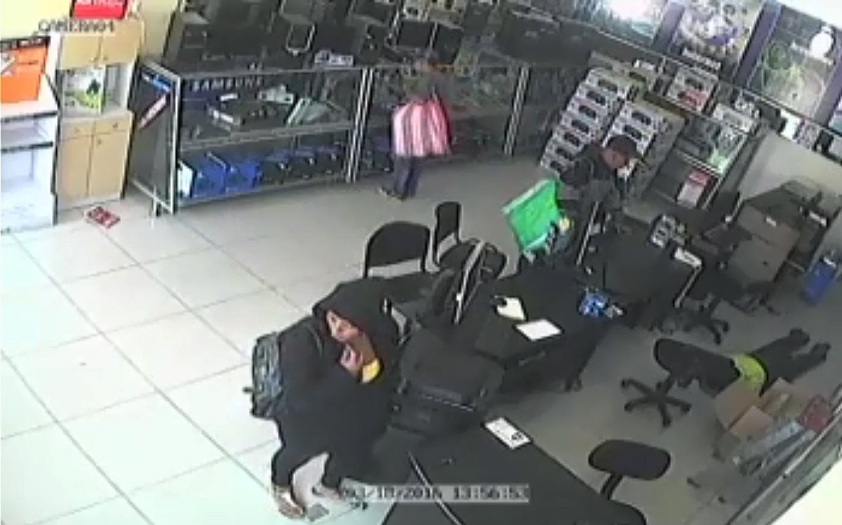 Dos hombres y una mujer con armas de fuego asaltaron la venta de computadoras MTI. En las imágenes, proporcionadas por el comercio afectado, se evidencia cómo los maleantes obligaron al encargado a tirarse al suelo mientras colocaban la mercadería en el interior de unas bolsas.