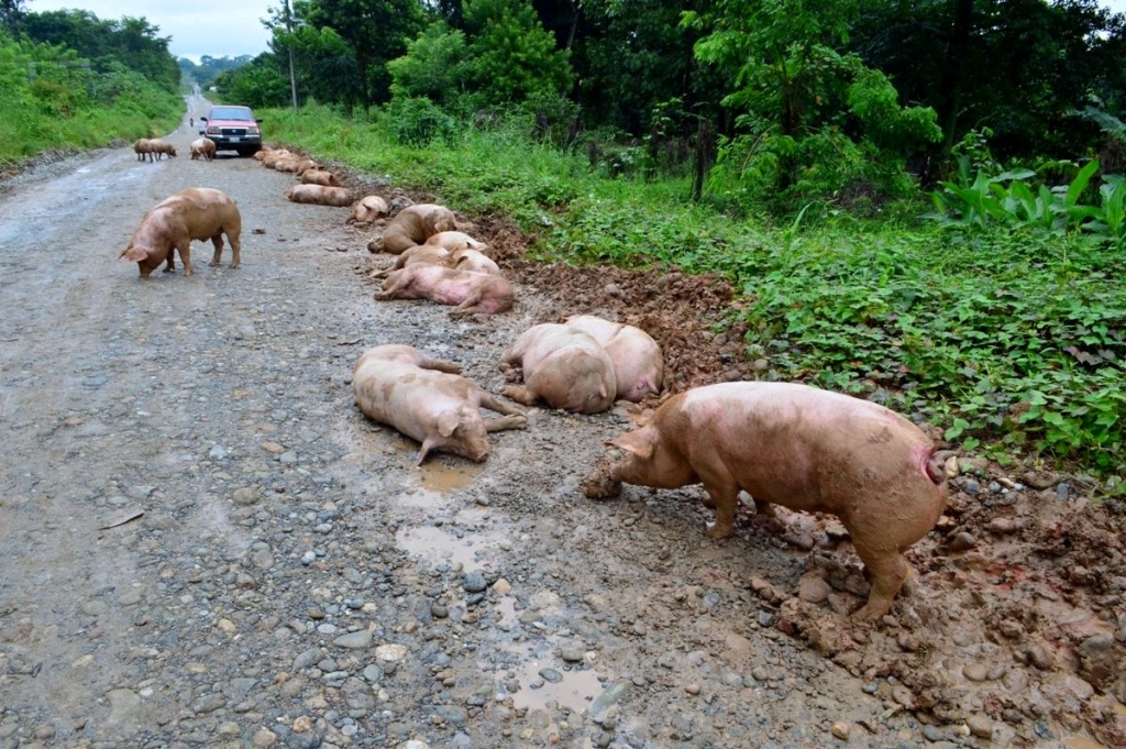 “Las llantas del camión se atascaron y volcó; los puercos salieron expulsados y murieron a causa de los golpes. Otros murieron en la carrocería y la gente me ayudó a reunir los animalitos muertos”, manifestó Rivas.