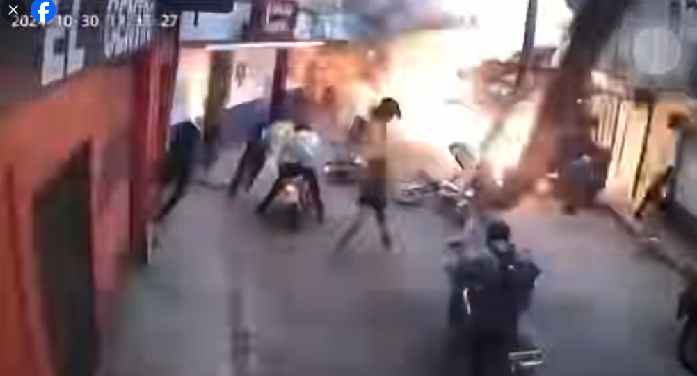 En el video de cámaras de seguridad se observa que transeúntes y motoristas pasan cerca del comercio cuando se registra una explosión.