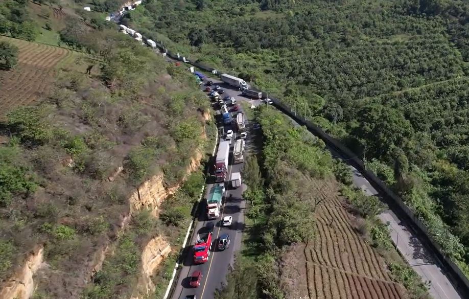 Largas filas de vehículos en la Ruta Nacional 14 y la ruta CA-10. (Foto Prensa Libre: Captura de video de muni de Ciudad Vieja)