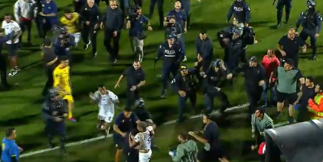 Acto seguido, los aficionados también se unieron a la trifulca e intentaron meterse al campo a la fuerza, lo que provocó la reacción de las autoridades y también terminaron enfrentándose a golpes. Algunos jugadores también los recibieron con golpes; un bochorno total.