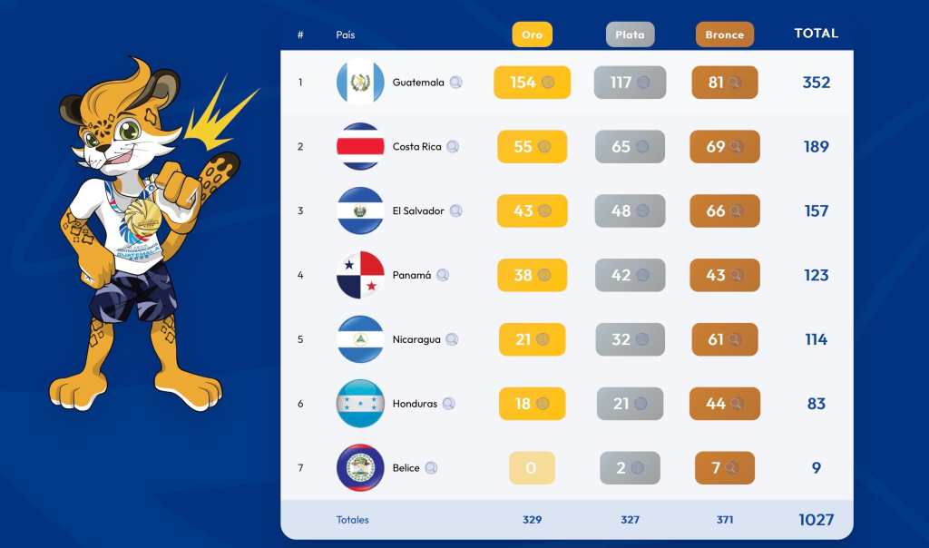 Guatemala domina con 154 oros y 352 medallas totales, casi el doble de Costa Rica en la segunda posición, consolidando una participación histórica pocos días del cierre.