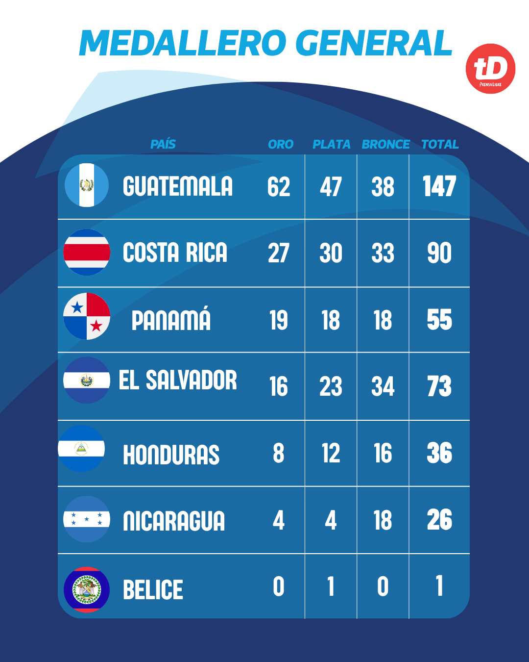 Más abajo figura El Salvador, en la cuarta casilla, con 73 medallas (16 de oro, 23 de plata y 34 de bronce), mientras que Honduras es quinto con 36 preseas, Nicaragua sexto con 26 y Belice cierra la tabla con una sola medalla de plata.
