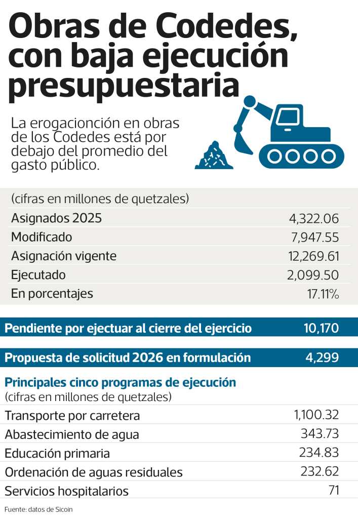 Con base en la información disponible del Minfin, los Codedes tienen asignados Q12 mil 269.61 millones, de los cuales han ejecutado Q2 mil 99 millones, equivalente al 17.11%.