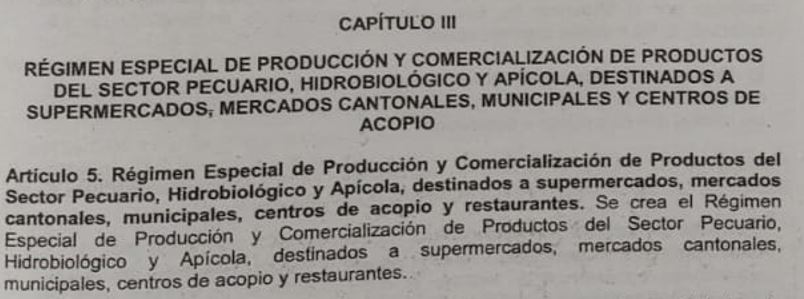 Al igual que el régimen para productores agrícolas y de artesanías, las ventas de los sectores pecuario, hidrobiológico y apícola deben destinarse a supermercados, mercados cantonales, mercados municipales, centros de acopio y restaurantes, es decir, a la venta dentro del territorio nacional.