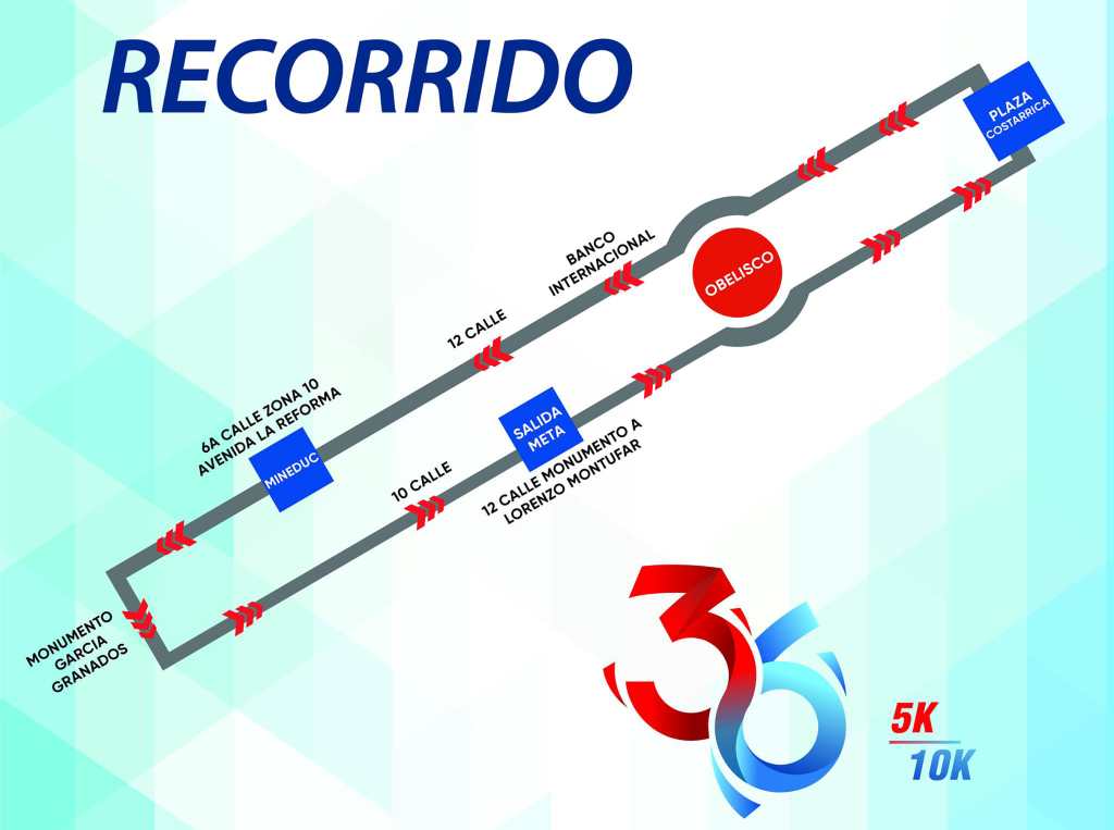La salida será enfrente al monumento Lorenzo Montufar, Avenida Reforma, 12 calle, zona 9 capitalina, rumbo hacia la Plaza Costa Rica, en la Avenida Las Americas, donde será el retorno hasta llegar al monumento García Granados en la Avenida la Reforma, para luego dirigirse a la meta, frente al monumento Lorenzo Montufar.