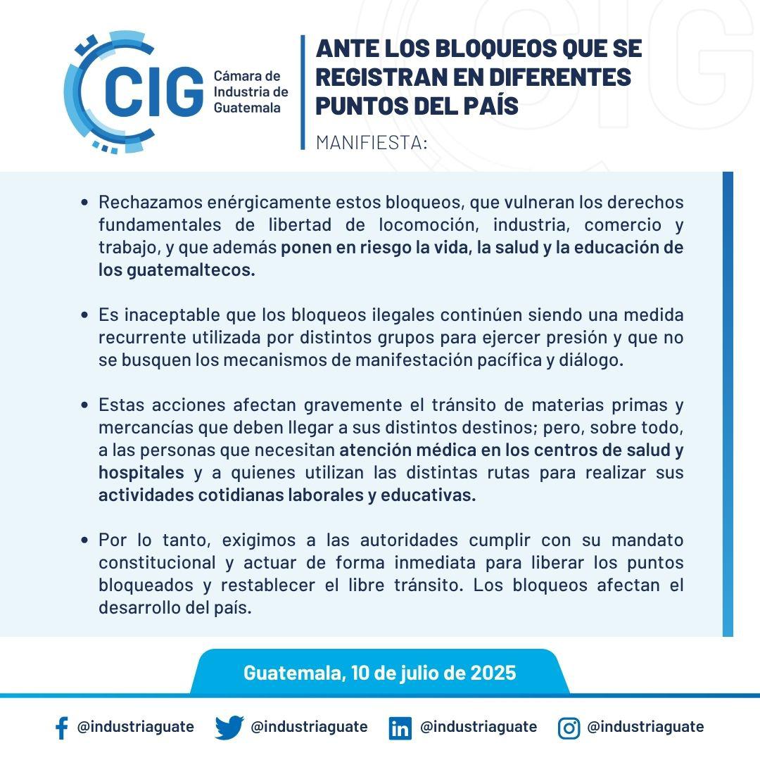 “Rechazamos enérgicamente estos bloqueos, que vulneran los derechos fundamentales de libertad de locomoción, industria, comercio y trabajo, y que además ponen en riesgo la vida, la salud y la educación de los guatemaltecos”, afirmó en un comunicado.