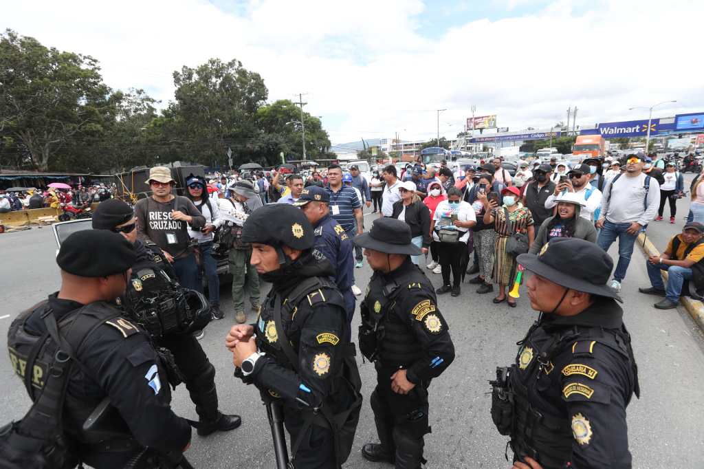 Un grupo de las Fuerzas Especiales de Policía llega a la calzada Roosevelt y 6 avenida, zona 11, para dialogar con los manifestantes.