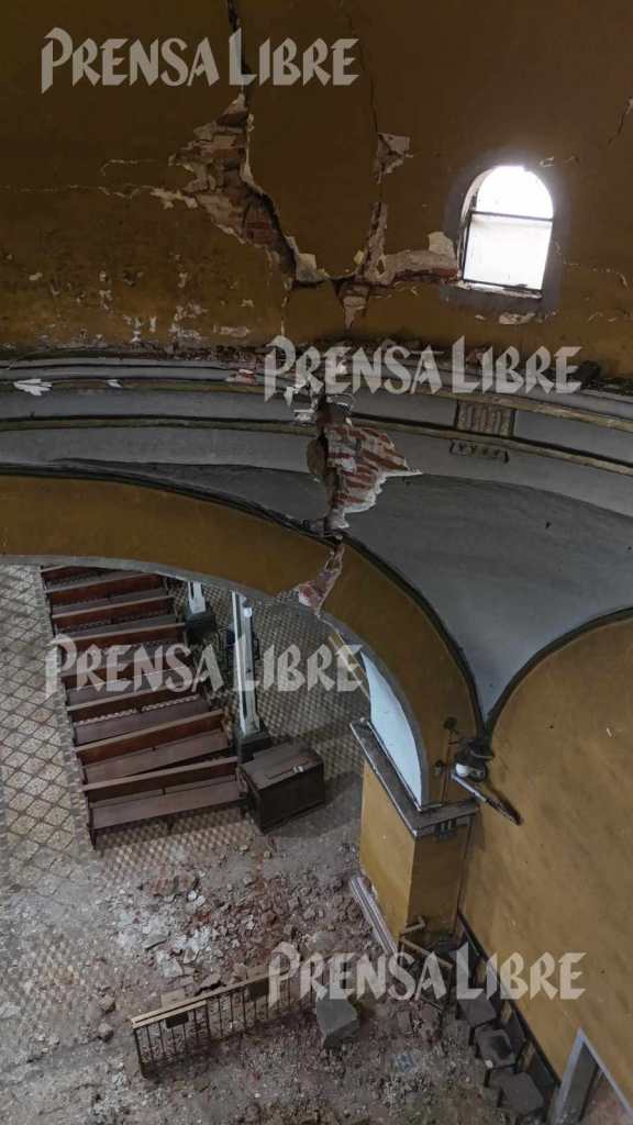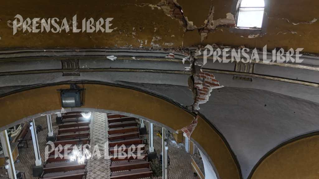 Al ingreso del templo solo se observan escombros. En el altar mayor todos los arreglos florales quedaron tirados y se encuentran llenos de polvo y ladrillos que cayeron de la cúpula que está agrietada en su totalidad.