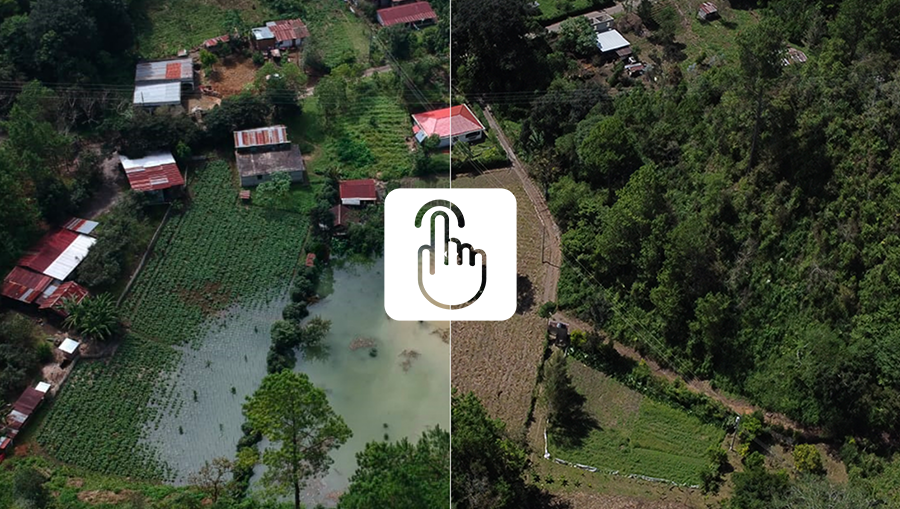 La primera imagen fue tomada el 10 de noviembre de 2020, donde se muestra las inundaciones que afectaron los cultivos de maíz, frijol, arroz, palma de aceite, banano y plátano. La segunda toma es de un año después, donde se nota buena parte de los terrenos ya recuperados.