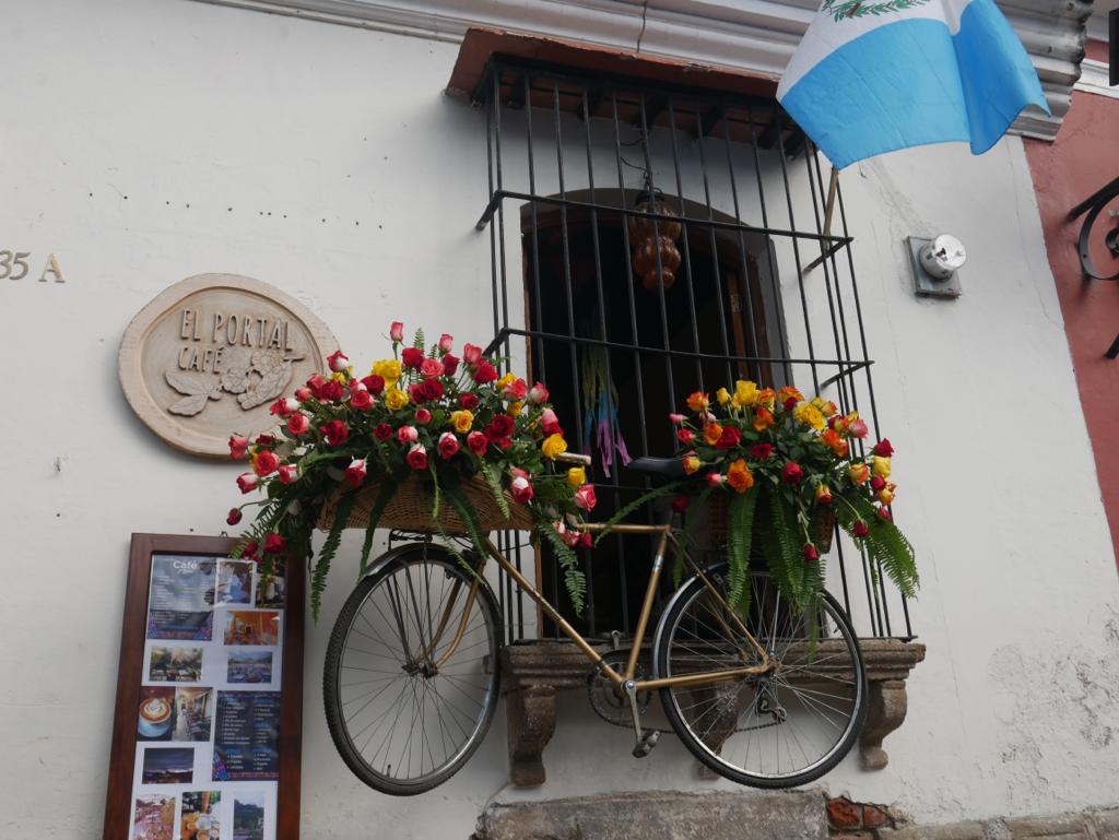 Delicadas rosas adornan un bicicleta colgada en una de las fachadas durante una edición pasada del Festival de las Flores en Antigua Guatemala. (Foto Prensa Libre: Emmy Sánchez)