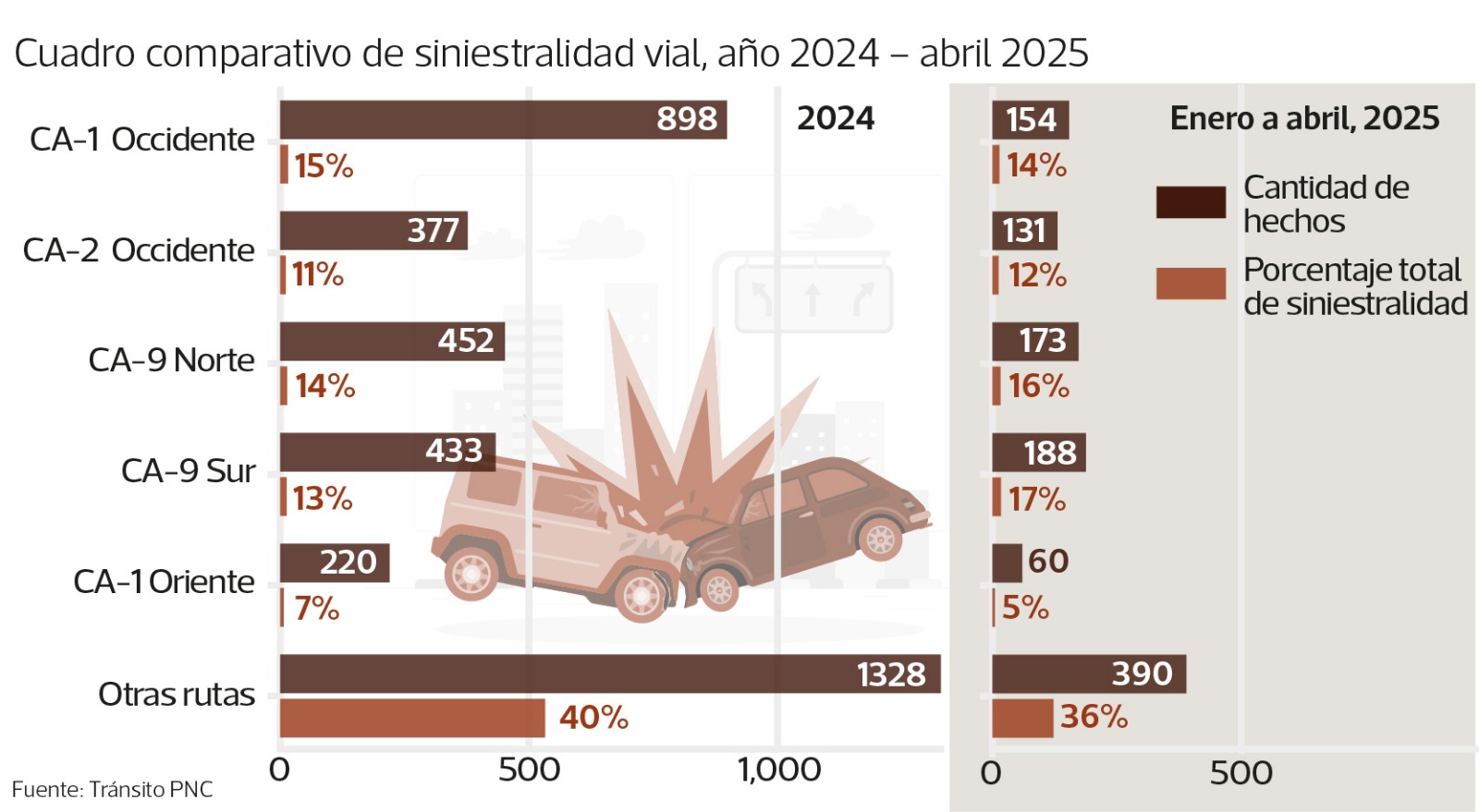 En términos relativos, las rutas CA-09 Norte y CA-09 Sur muestran un incremento en su participación porcentual dentro de la siniestralidad total. La CA-09 Norte pasó del 14% al 16%, mientras que la CA-09 Sur subió del 13% al 17%, lo que sugiere una mayor concentración de riesgos en estas vías altamente transitadas por transporte pesado.