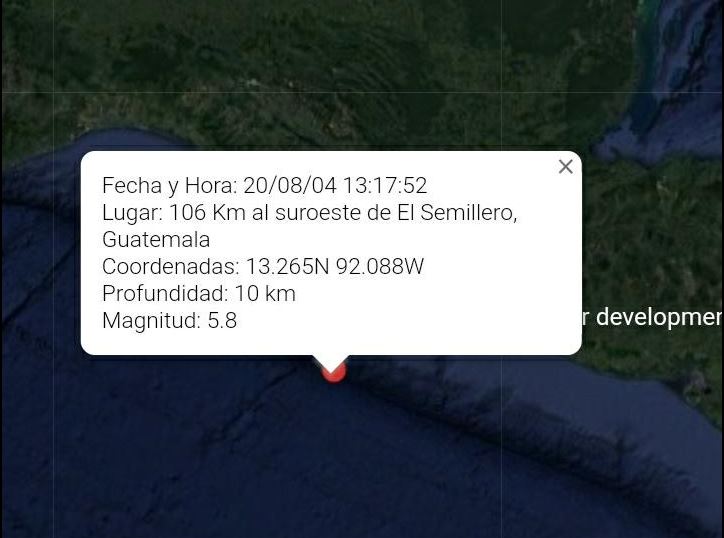 De acuerdo con los primeros reportes de la Coordinadora Nacional para la Reducción de Desastres (Conred), el movimiento telúrico se registró a las 13:17 horas y cuyo epicentro se ubicó 106 kilómetros al Suroeste de El Semillero, en Tiquisate, Escuintla.