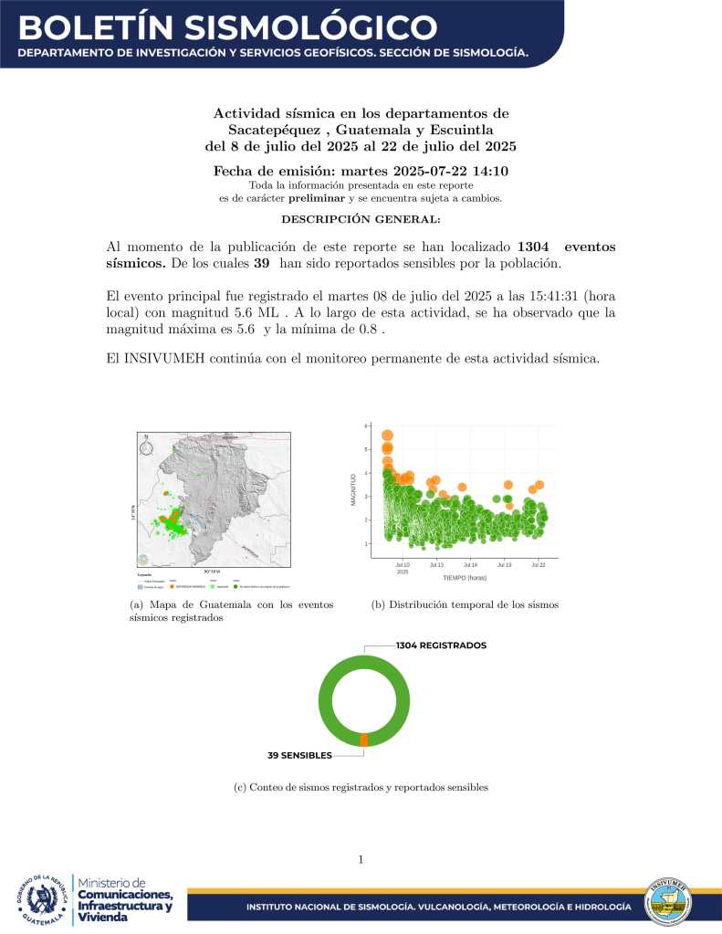 El Insivumeh reportó que, hasta las 14.10 horas del 22 de julio, se habían contabilizado 1,304 eventos sísmicos desde el 8 de julio. De estos, 39 fueron percibidos por la población.