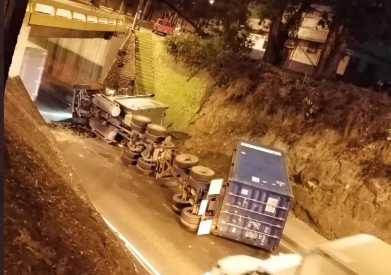 #TráficoGT | Autoridades de Tránsito de Mixco informan que un tráiler volcó bajo el puente La Ruedita, zona 3 de la capital. El percance afecta la incorporación de vehículos que vienen del Anillo Periférico y bulevar El Naranjo hacia la Calle Martí.