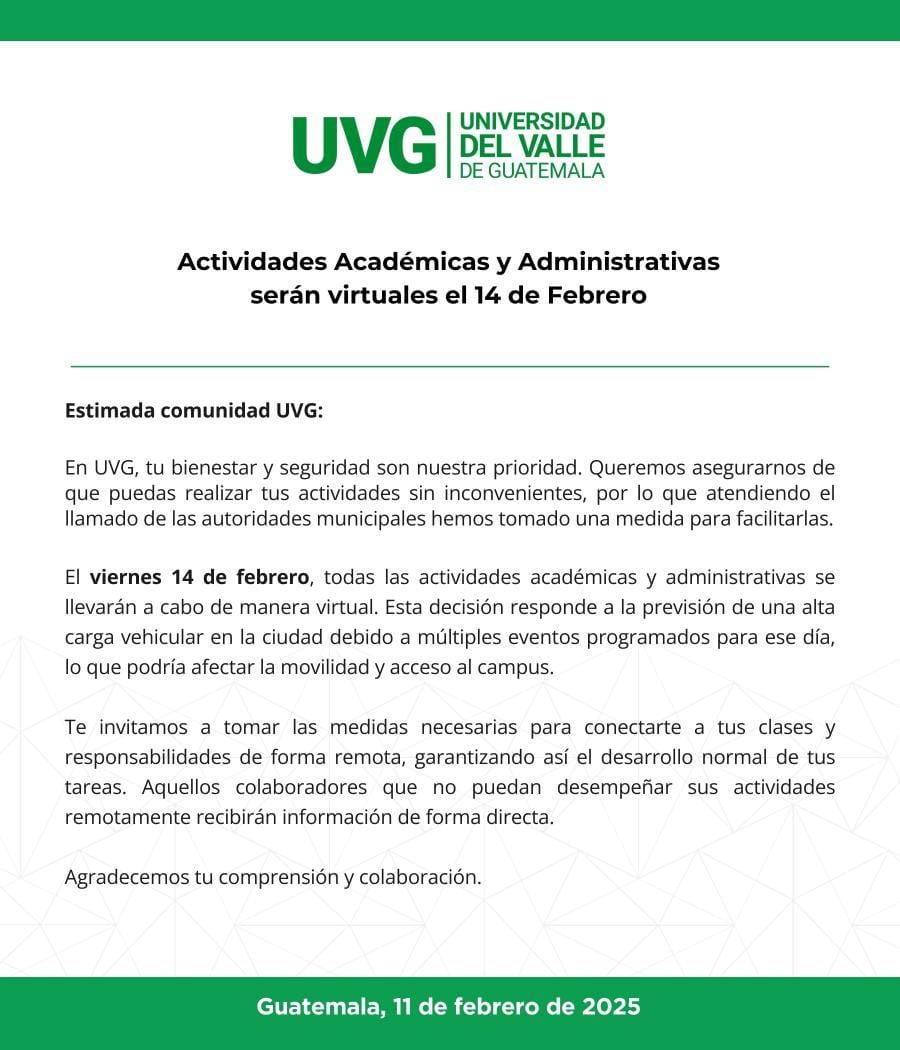"Esta medida responde a la previsión de una alta congestión vehicular en la ciudad debido a eventos programados, y permite la continuidad de nuestras actividades sin afectar la movilidad ni la seguridad de los estudiantes, docentes y colaboradores", señala la Universidad Galileo.