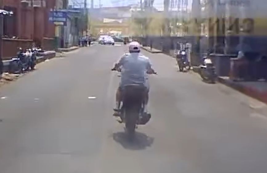 Un motorista sin placas visibles fue sorprendido el pasado 26 de mayo mientras obstruía el paso de una ambulancia que se dirigía a la ruta la Pacífico a cubrir una emergencia. (Foto Prensa Libre: cortesía de los Bomberos Voluntarios de Amatitlán)