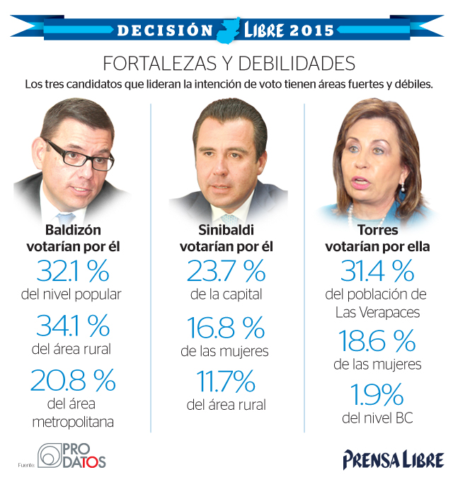 Obviamente, en las cábalas electorales queda mucha tela por cortar, y una de ellas es que si se evalúa a Baldizón en relación con los votos válidos, su preferencia en este momento se eleva hasta alcanzar una diferencia de 10.2 por ciento para llegar al 50 por ciento que le permitirían hacer realidad su sueño de alcanzar la Presidencia en primera vuelta. En este mismo ámbito, tanto Sinibaldi como Torres estarían a 30.6 por ciento del 50 por ciento, con lo cual, en ambos, resulta por ahora impensable la pretensión de alcanzar el poder en una primera vuelta.
