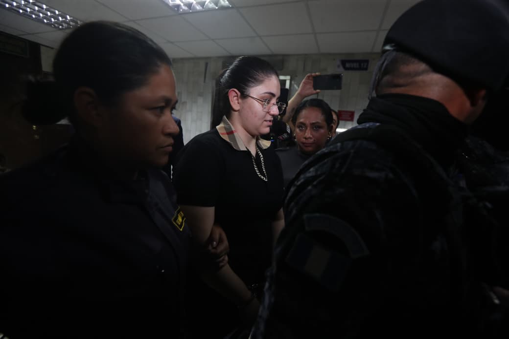Fernanda Bonilla sale de la sala de audiencias tras denunciar a una abogada por vulnerar sus derechos. (Foto Prensa Libre)