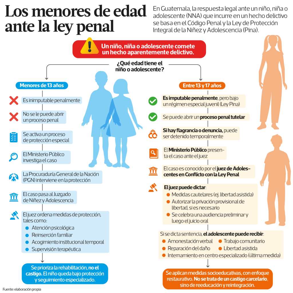 De acuerdo con la legislación guatemalteca, los menores de 13 años no pueden ser sometidos a un proceso penal y la ley PINA garantiza sus derechos y diferencia el tratamiento legal según la edad.