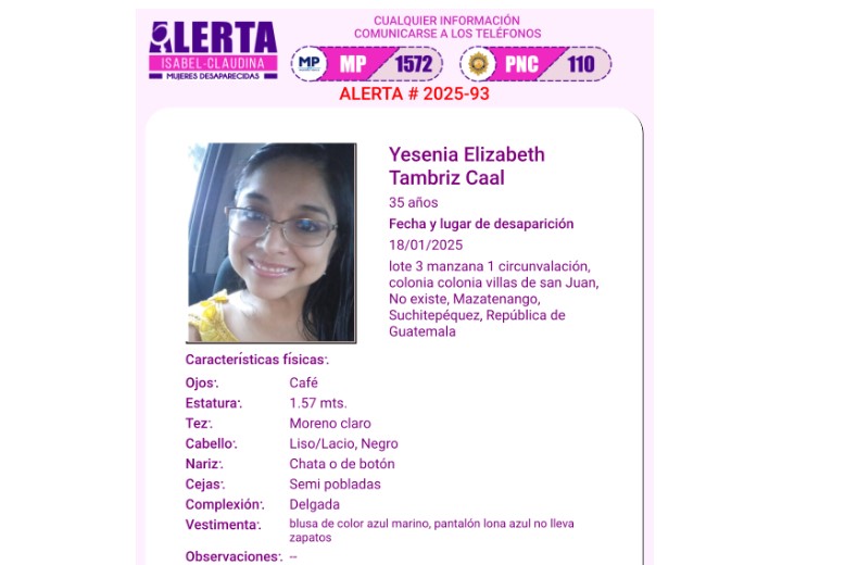 La Policía Nacional Civil (PNC) y el Ministerio Público (MP) informaron este sábado 25 de enero sobre la liberación "sana y salva" de la médica Yesenia Elizabeth Tambriz Cal, que había desaparecido en Mazatenango y se desconocía su paradero.