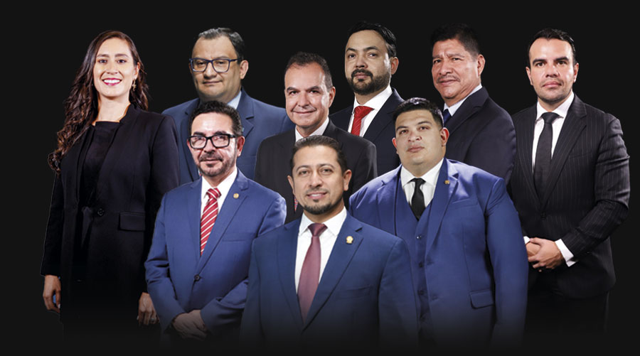 De izquierda a derecha: Karina Paz, Mario Gálvez, Jorge Ayala, Juan Carlos Rivera, Sabino Velásquez, Jorge Castro, Nery Ramos y Kevyn Escobar, integrantes de la Junta Directiva del Congreso de la República. (Foto Prensa Libre: Congreso -Diseño Marcos Gálvez)