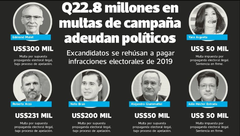 Otro candidato en la misma situación fue Edmond Mulet, excandidato a la presidencia por el Partido Humanista, quien debe dos sanciones que suman US$300 mil 006 por propaganda electoral ilegal.