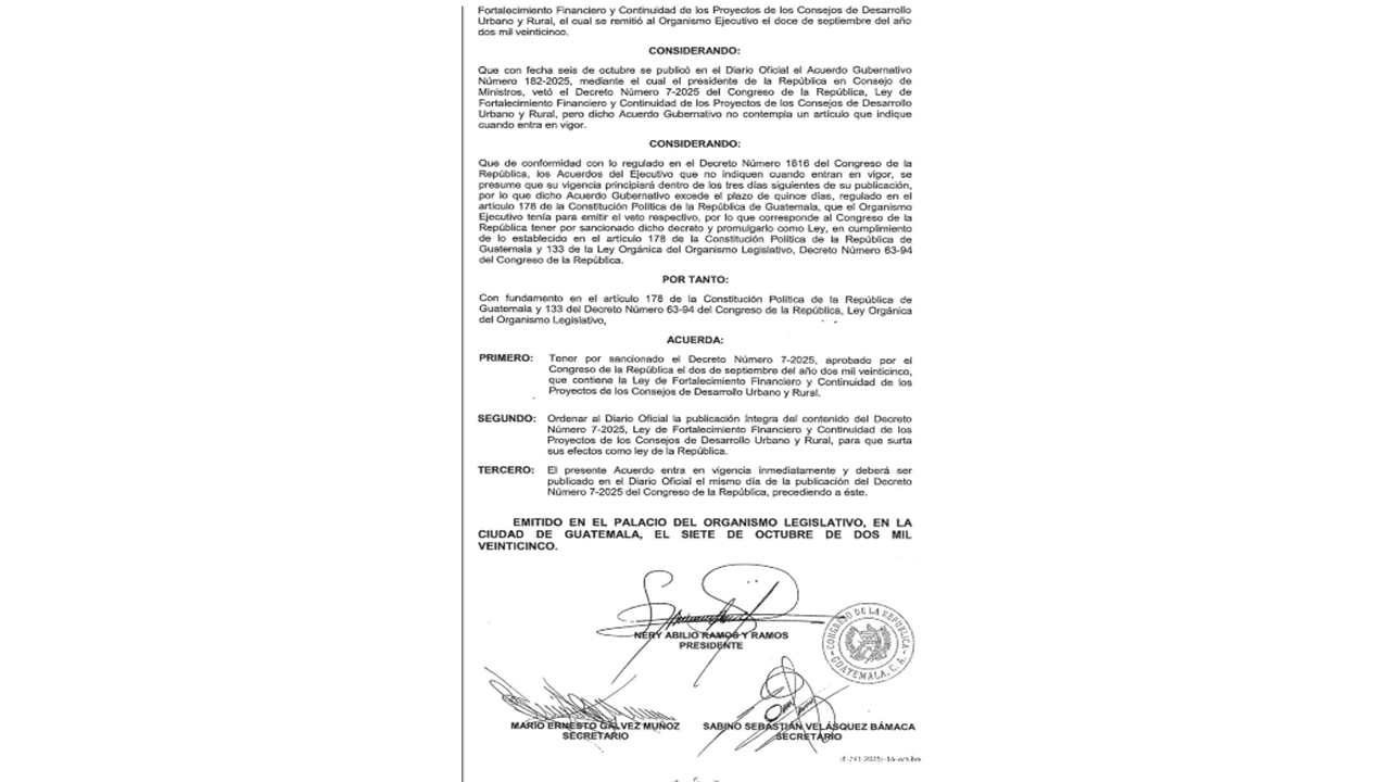 El Congreso publicó este 16 de octubre el Decreto 7-2025, Ley de Fortalecimiento Financiero y Continuidad de los Proyectos de los Consejos de Desarrollo Urbano y Rural, en el Diario de Centro América, pese al veto presidencial del 3 de octubre.