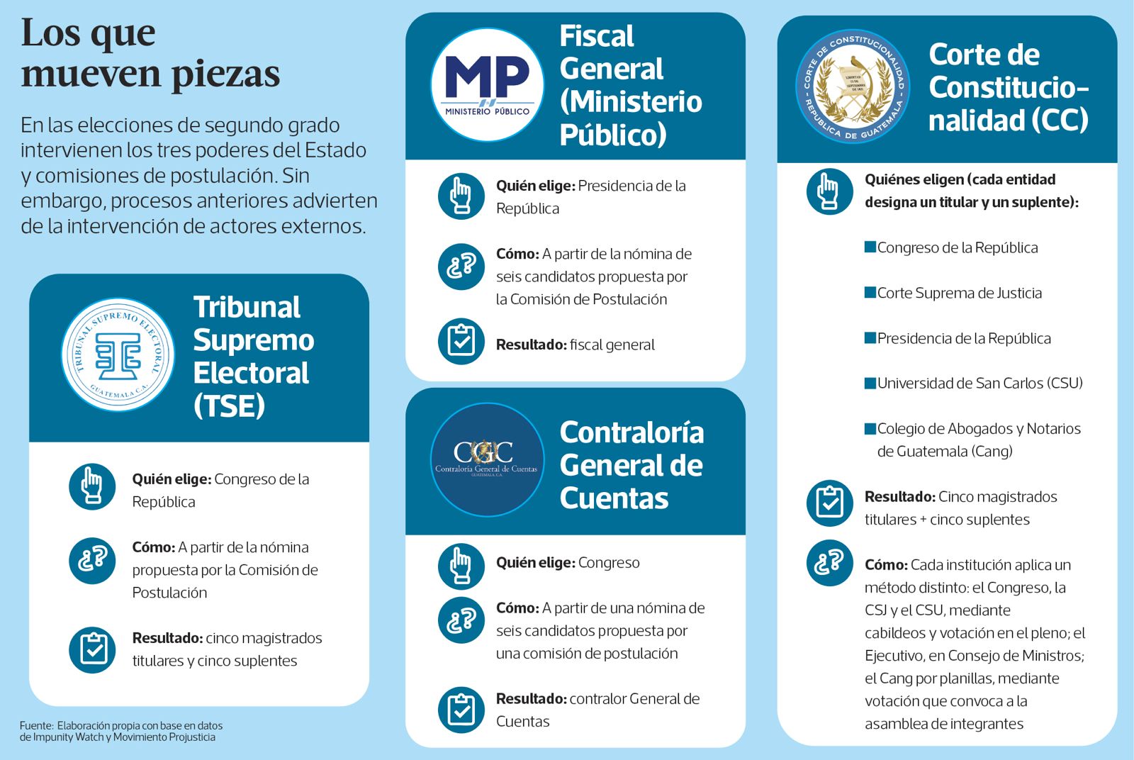 El próximo año deberán renovarse las autoridades del Tribunal Supremo Electoral (TSE), la Corte de Constitucionalidad (CC), el fiscal general del Ministerio Público (MP) y la Contraloría General de Cuentas (CGC).