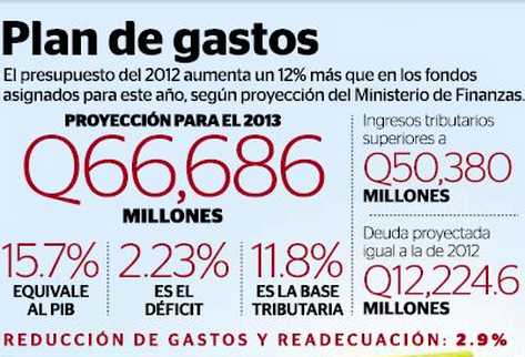 Para el 2012, el plan de gastos del Estado es de Q59 mil 547 millones, por lo que el proyecto de presupuesto para el 2013 sería Q7 mil 139 millones más alto, que significa un aumento de 12 por ciento.