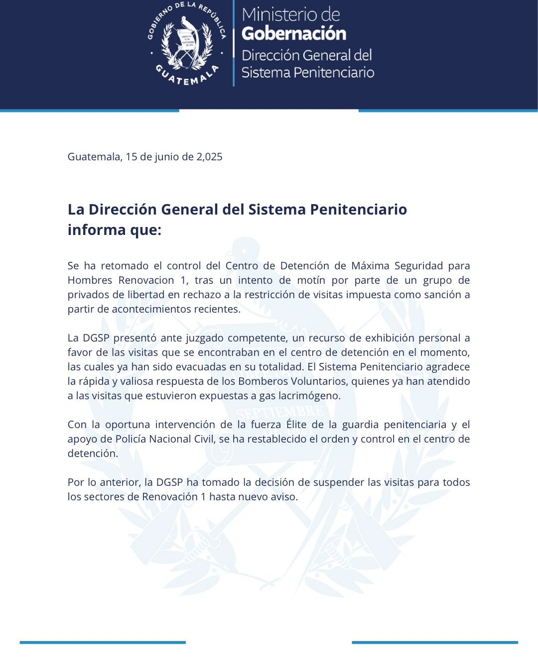 Posteriormente, la Dirección General del Sistema Penitenciario emitió un comunicado en donde señalan que los privados de libertad intento amotinar Renovación I en "rechazo a la restricción de visitas impuestas como sanción a partir de acontecimientos recientes".