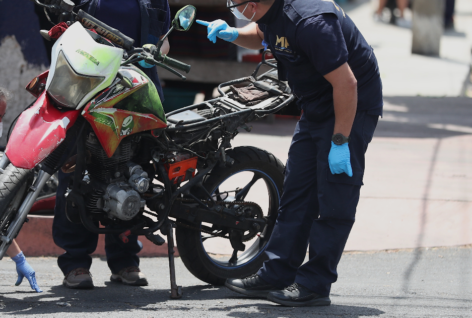 Motocicleta en la que se desplazaban los sicarios en La Florida es inspeccionada por investigadores del Ministerio Público. (Foto Prensa Libre: Esbin García)