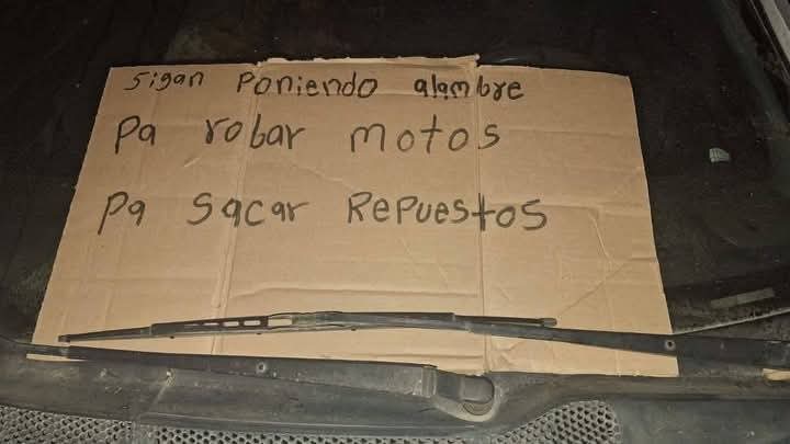 En la parte frontal de dicho vehículo se encontró una nota con la leyenda: “Sigan poniendo alambre. Pa robar motos. Pa sacar repuestos”.