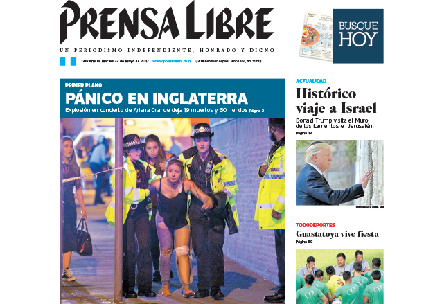 Portada de Prensa Libre del 23 de mayo de 2017 informando sobre el atentado de Manchester, Inglaterra. (Foto: Hemeroteca PL)