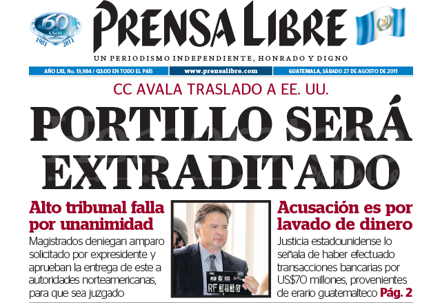 Fue noticia el 27 de agosto de 2011 la confirmación de la extradición del expresidente Alfonso Portillo, quien era reclamado por Estados Unidos por conspiración para el lavado de US$70 millones provenientes de las arcas del Estado guatemalteco.
