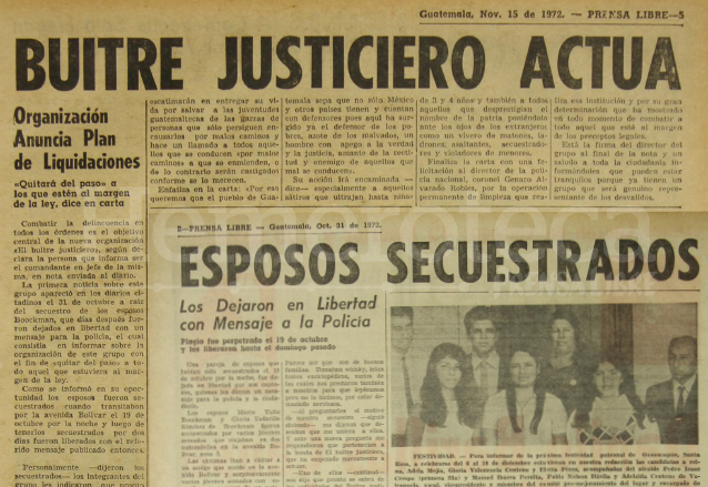 La organización “Buitre Justiciero” tiene su primera aparición en los medios de comunicación el 31 de octubre de 1972 cuando se informaba de la liberación de una pareja de esposos quienes estaban cautivos desde el 19 de octubre del mismo año. Los esposos fueron identificados como Marco Tulio Boockman y Gloria Yadarillis Sánchez de Boockman, fueron secuestrados por varios jóvenes armados que viajaban en dos automóviles en la avenida Bolívar zona 3.