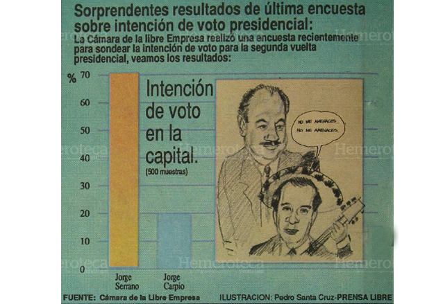 La intención del voto, según la encuesta de Mora y Araujo, Noguera y Asociados, de Buenos Aires, Argentina, destacó que Serrano estaba en primer lugar con un 67%, encima de Carpio que tenía un 23%.