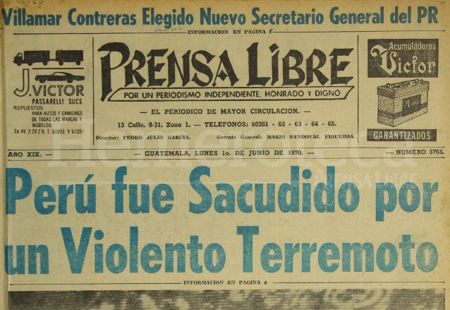 Sin embargo, un hecho que conmocionó al continente fue un fuerte sismo que devastó varias regiones del Perú mientras se disputaba el partido inaugural del Mundial de Fútbol. Prensa Libre recogió en su edición del 1 de junio de 1970 las primeras informaciones del movimiento telúrico.