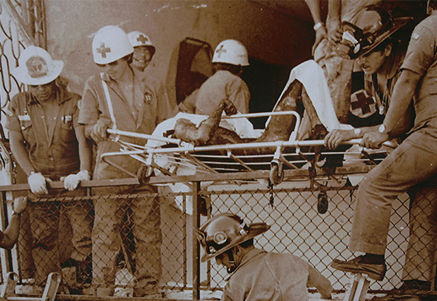 Elementos de los cuerpos de socorro proceden a retirar los restos carbonizados de las víctimas del incendio de la embajada de España en Guatemala el 31 de enero de 1980. (Foto: Hemeroteca PL)