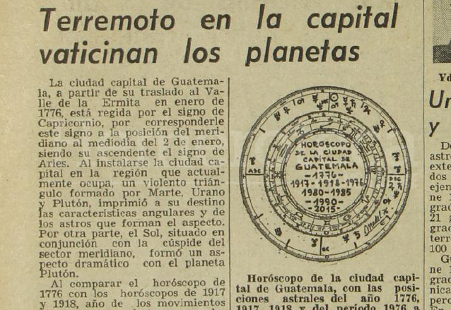 Pero lo que más llamaba la atención era el vaticinio que hacía titulado: Terremoto en la capital vaticinan los planetas. El astrólogo tomaba en consideración el asentamiento de la ciudad el 2 de enero de 1776 siendo el signo que la rige el de Capricornio por la posición del meridiano al medio día de esa fecha.
