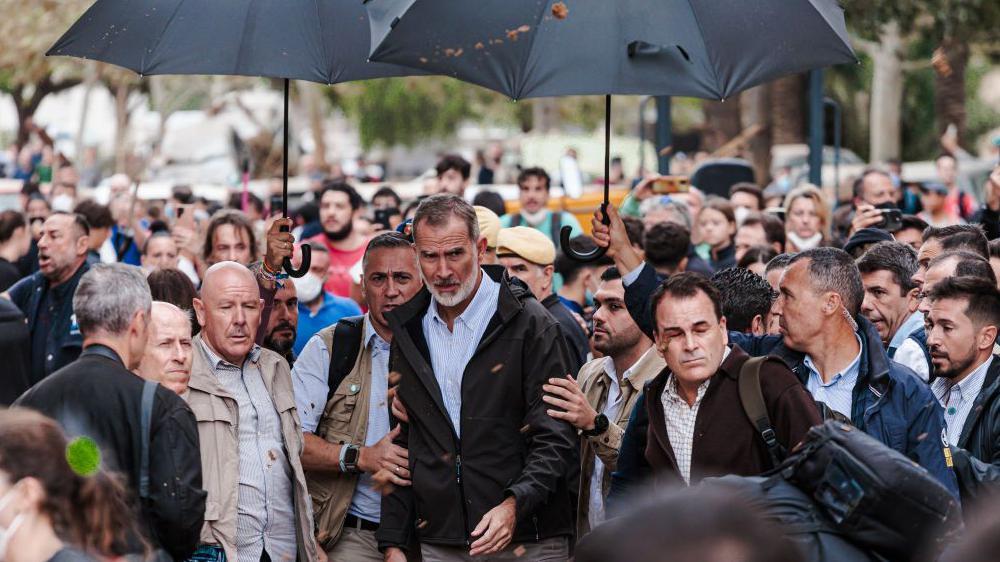 Pero muchos de los afectados no se han tomado bien la visita y respondieron lanzando barro y otros objetos y gritando “¡asesinos, asesinos!” a la comitiva, en la que también participaba el presidente regional, Carlos Mazón, del Partido Popular, y la reina Letizia.