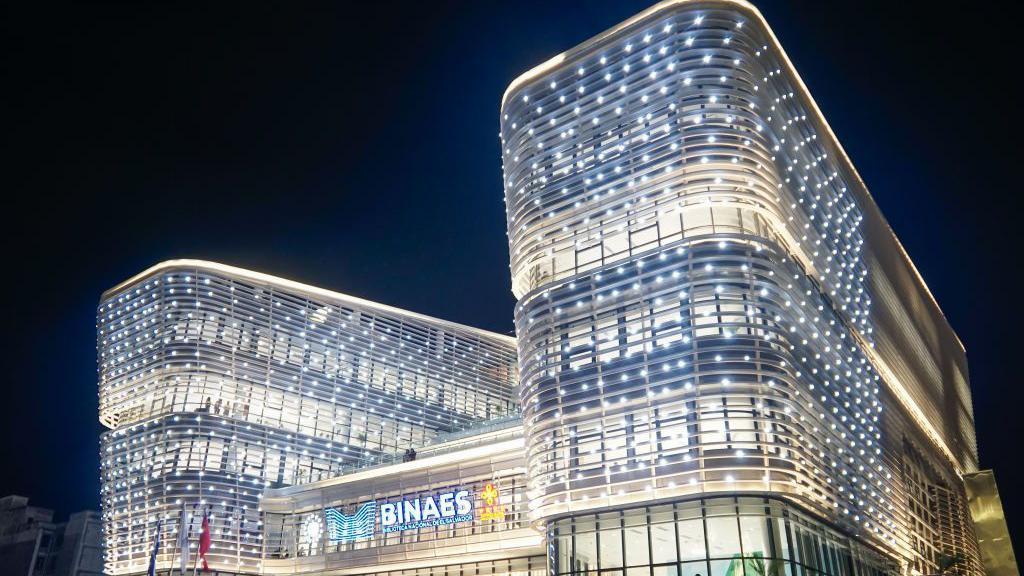 Una colosal urna de cristal de siete pisos y bordes sinuosos iluminada las 24 horas del día.